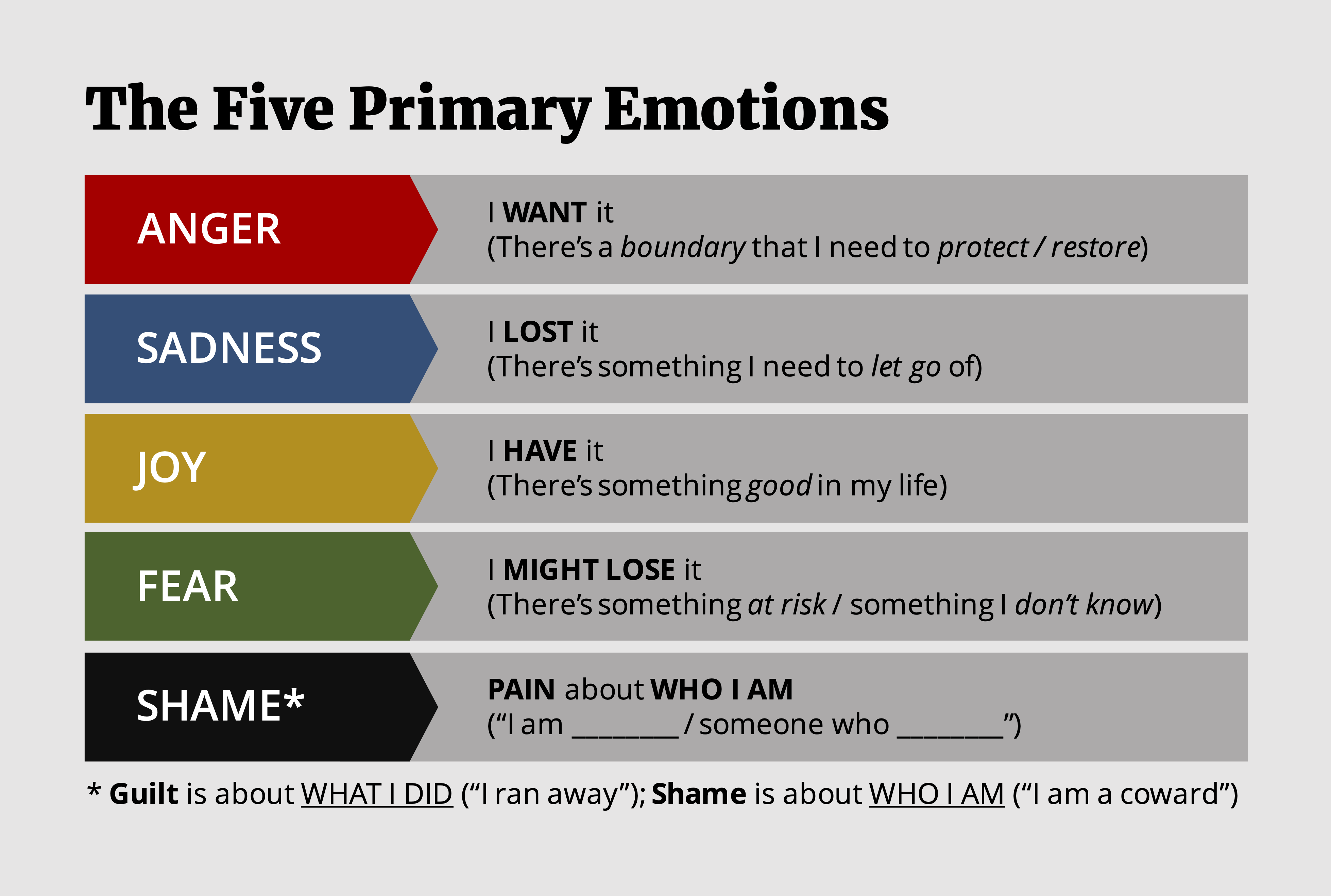 Here’s how I was first introduced to the activity. Have a group sit or stand in a circle. Give each person a “Primary Emotions Card” which lists five primary emotions and a sentence parsing out that emotion - for example, SADNESS: I LOST it (There’s something I need to let go of.). The first person in the circle says what emotion (of the five listed) they are feeling ‘on top’ and use the given sentence to help parse out the feeling – e.g., if they identify sadness, then they give name to what they’ve lost or need to let go of. Then, with that top layer cleared, they say what emotion is under that, and parse it out the same way. They continue with further layers of emotions until they’re done, and the next person in the circle can begin.